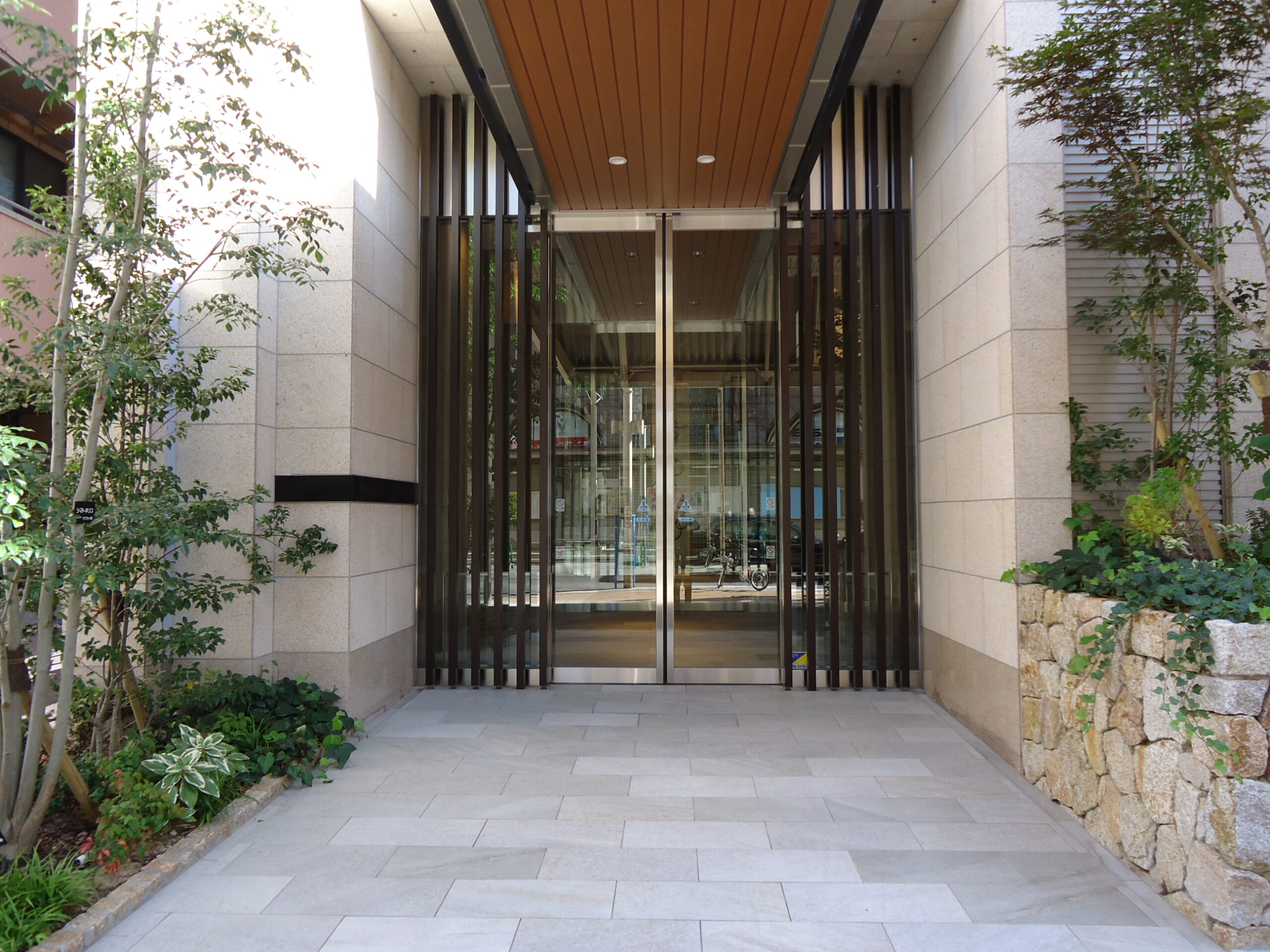 分譲時の面積は約56~68㎡、間取りは2LDK・3LDKの、DINKS~ファミリーまで幅広い層に対応しています。エントランス扉の向こうには重厚感漂うラウンジスペースが広がります。